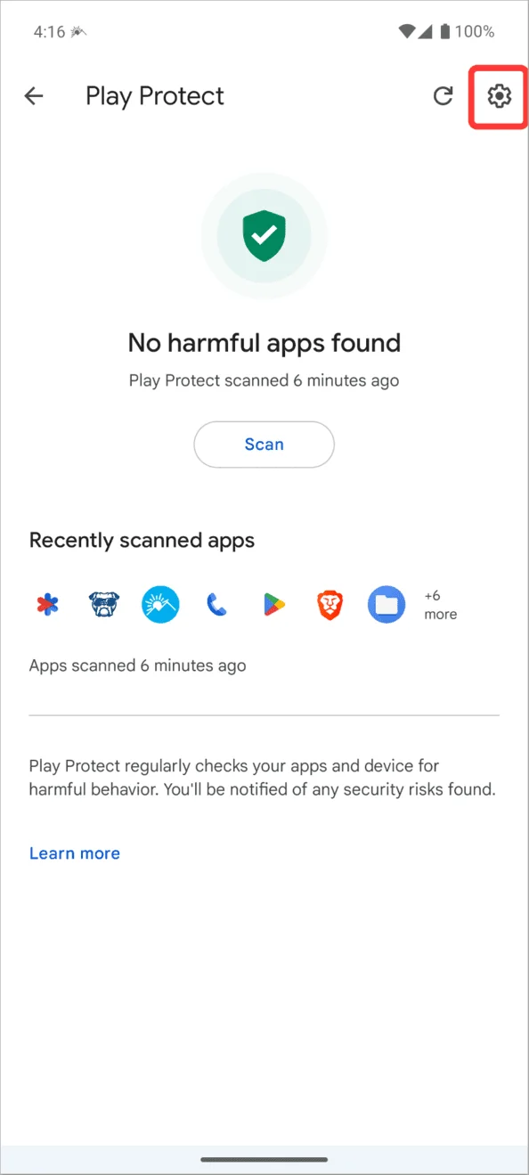 - Toggle off “Scan apps with Play Protect.”